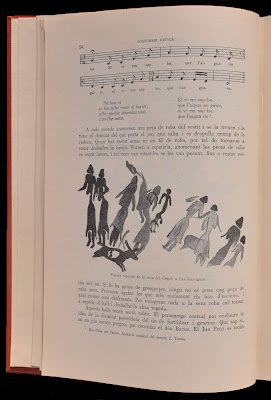 Pàgina del Costumari amb una xilografia d'uns enamorats. Prèviament va ser publicada a les Xilografies gironines